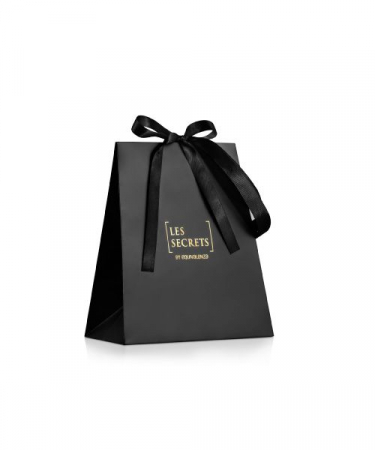 Punga Les Secrets mica, realizata din hartie certificata FSC. Cu o forma hexagonala unica si originala. Cu un finisaj premium si elegant care defineste linia, precum si o culoare neagra mata si detalii aurii stralucitoare. Manere negre si panglici din satin de aceeasi culoare ca si sistemul de inchidere.